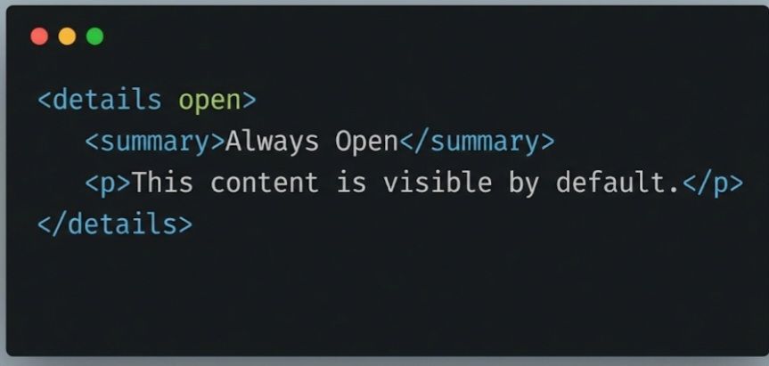 By default, the content of a <details> element is hidden. If you want the content to be visible when the page loads, you can add the open boolean attribute to the <details> tag. The user can still click the summary to collapse it.