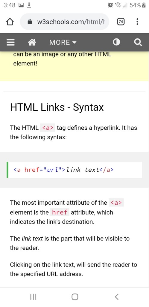 The <a href=”leontheprogressivecoder.com”>The Progressive Coder Website link</a>. The (a) anchor and href tells your browser where to go. The so-called “href” or “anchor” tag, ends with </a>. Note : the text in between the opening <a href> and closing tag </a> is where your visitors will click on to go to the site or page you want your visitors to go.